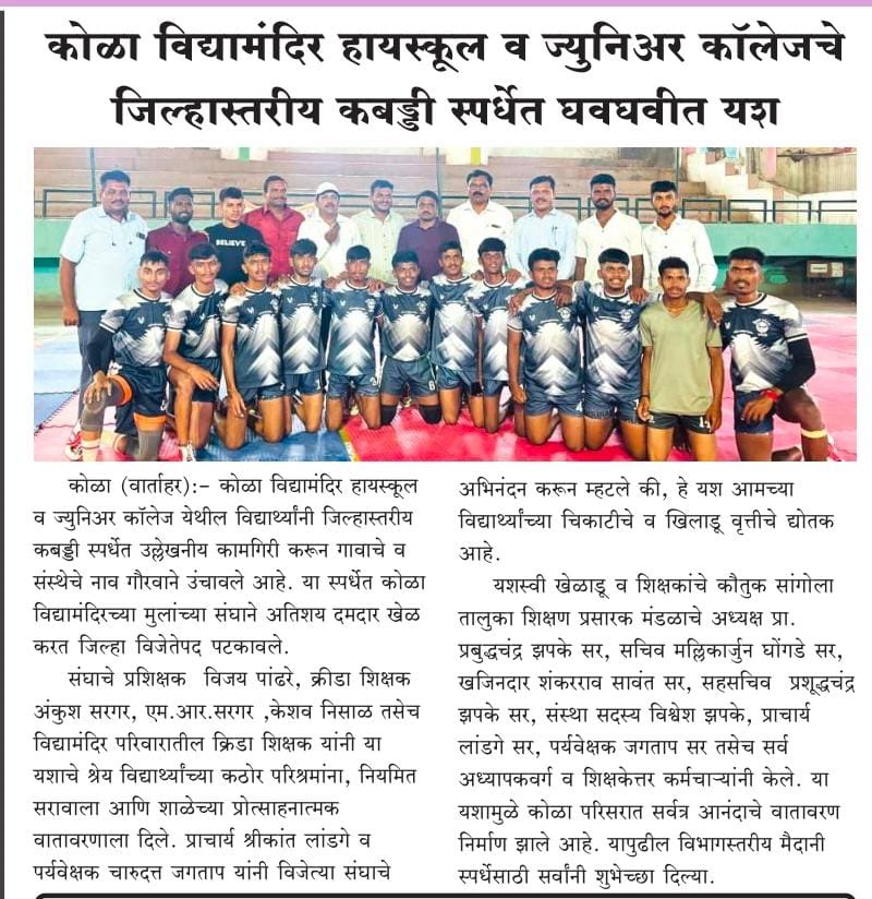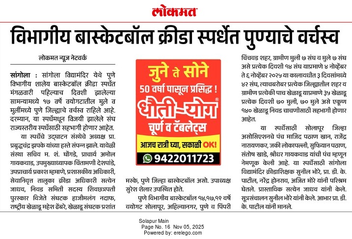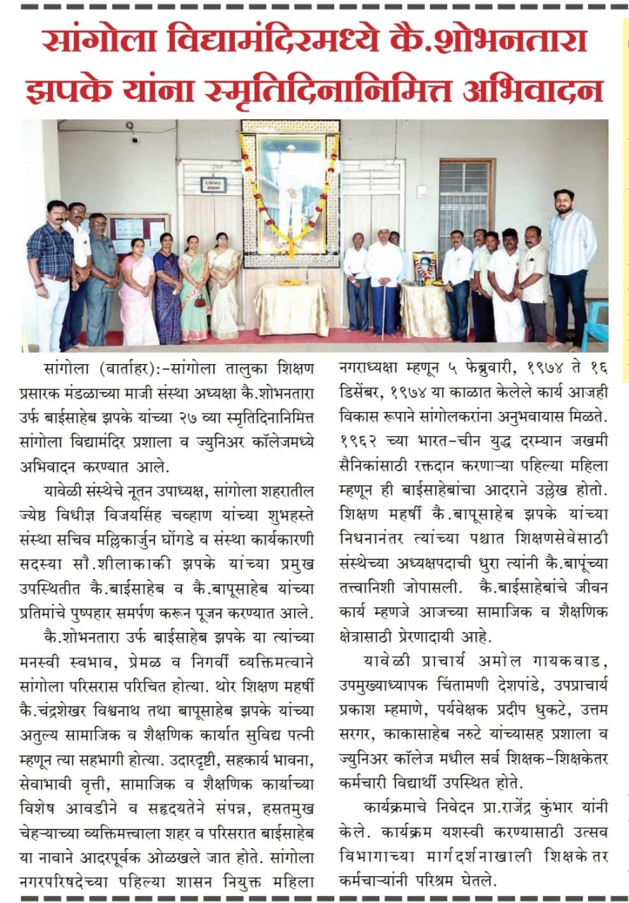 सांगोला तालुका शिक्षण प्रसारक मंडळाचा संस्कारक्षम संस्था पुरस्काराने आज होणार सन्मान सांगोला विद्यामंदिर इंग्लिश मेडिअम स्कूलचे कराटे स्पर्धेत यश विभागीय बास्केटबॉल क्रीडा स्पर्धेत पुण्याचे वर्चस्व सांगोला विद्यामंदिरमध्ये कै . शोभानंतर झपके यांना स्मृतिदिनानिमित्त विनम्र अभिवादन कोळा विद्यामंदिर हायस्कूल व ज्युनिअर कॉलेजचे जिल्हास्तरीय कब्बड्डी स्पर्धेत घवघवीत यश अकलूज ,माढ्याचे संघ विजयी :शालेय बास्केटबॉल स्पर्धा सांगोला विद्यामंदिरचीही बाजी नाझरा विद्यामंदिर प्रशाला नेट बॉल स्पर्धेत जिल्ह्यात प्रथम सांगोला विद्यामंदिरमध्ये वन्यजीव सप्ताह विविध स्पर्धांनी साजरा सांगोला विद्यामंदिर प्राथमिक विद्यालयाची इयत्ता दुसरीची क्षेत्रभेट (परिसर भेट ) सांगोला तहसील कार्यालय येथे संपन्न व्हॉट्स अँपवरील स्टेटसपेक्षा आई वडिलांचे स्टेटस वाढावा :गिरी गुरुवर्य बापूसाहेबांनी अंगीकारलेले विचार व तत्व नवसंजीवन देणारे - कै.गुरुवर्य बापूसाहेब झपके यांच्या स्मृती समारंभाची सांगता गुरुवर्य बापूसाहेबांनी अंगीकारलेले विचार व तत्व नवसंजीवन देणारे बहुआयामी व्यक्तिमत्व श्री.चं .वि.तथा बापूसाहेब झपके सांगोला तालुका शिक्षण प्रसारक मंडळाचे संस्थाअंतर्गत गुणवंत शिक्षक व शिक्षकेत्तर पुरस्कार जाहीर केरळच्या केरला वर्मा कॉलेज त्रिशूळ संघास विजेतेपद -कै .गुरुवर्य चं.वि .तथा बापूसाहेब झपके ४४ वा स्मृती करंडक राष्ट्रीय बास्केटबॉल स्पर्धा