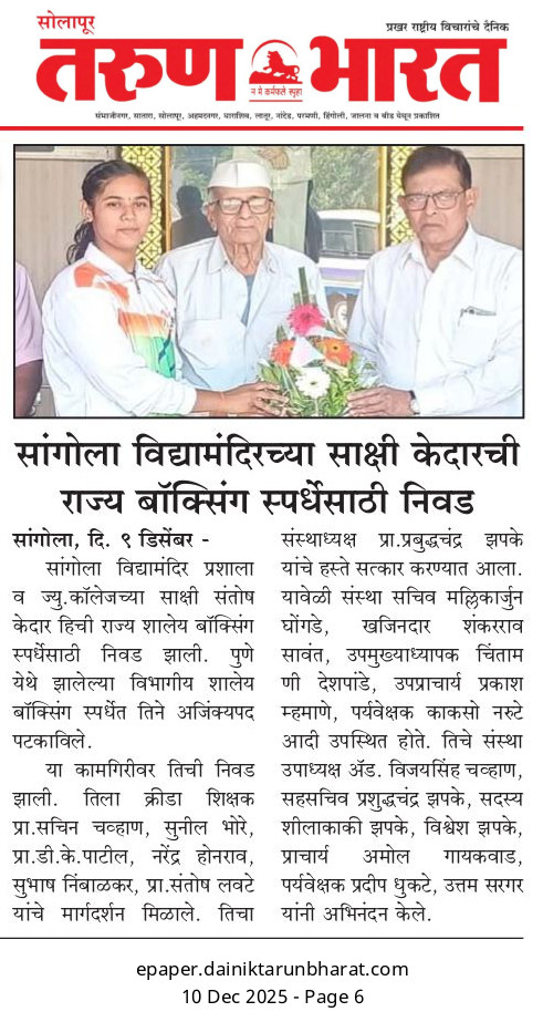 सांगोला विद्यामंदिरच्या साक्षी केदारची राज्य बॉक्सिंग स्पर्धेसाठी निवड सांगोला तालुका शिक्षण प्रसारक मंडळाचा संस्कारक्षम संस्था पुरस्काराने आज होणार सन्मान सांगोला विद्यामंदिर इंग्लिश मेडिअम स्कूलचे कराटे स्पर्धेत यश विभागीय बास्केटबॉल क्रीडा स्पर्धेत पुण्याचे वर्चस्व सांगोला विद्यामंदिरमध्ये कै . शोभानंतर झपके यांना स्मृतिदिनानिमित्त विनम्र अभिवादन कोळा विद्यामंदिर हायस्कूल व ज्युनिअर कॉलेजचे जिल्हास्तरीय कब्बड्डी स्पर्धेत घवघवीत यश अकलूज ,माढ्याचे संघ विजयी :शालेय बास्केटबॉल स्पर्धा सांगोला विद्यामंदिरचीही बाजी नाझरा विद्यामंदिर प्रशाला नेट बॉल स्पर्धेत जिल्ह्यात प्रथम सांगोला विद्यामंदिरमध्ये वन्यजीव सप्ताह विविध स्पर्धांनी साजरा सांगोला विद्यामंदिर प्राथमिक विद्यालयाची इयत्ता दुसरीची क्षेत्रभेट (परिसर भेट ) सांगोला तहसील कार्यालय येथे संपन्न व्हॉट्स अँपवरील स्टेटसपेक्षा आई वडिलांचे स्टेटस वाढावा :गिरी गुरुवर्य बापूसाहेबांनी अंगीकारलेले विचार व तत्व नवसंजीवन देणारे - कै.गुरुवर्य बापूसाहेब झपके यांच्या स्मृती समारंभाची सांगता गुरुवर्य बापूसाहेबांनी अंगीकारलेले विचार व तत्व नवसंजीवन देणारे बहुआयामी व्यक्तिमत्व श्री.चं .वि.तथा बापूसाहेब झपके सांगोला तालुका शिक्षण प्रसारक मंडळाचे संस्थाअंतर्गत गुणवंत शिक्षक व शिक्षकेत्तर पुरस्कार जाहीर