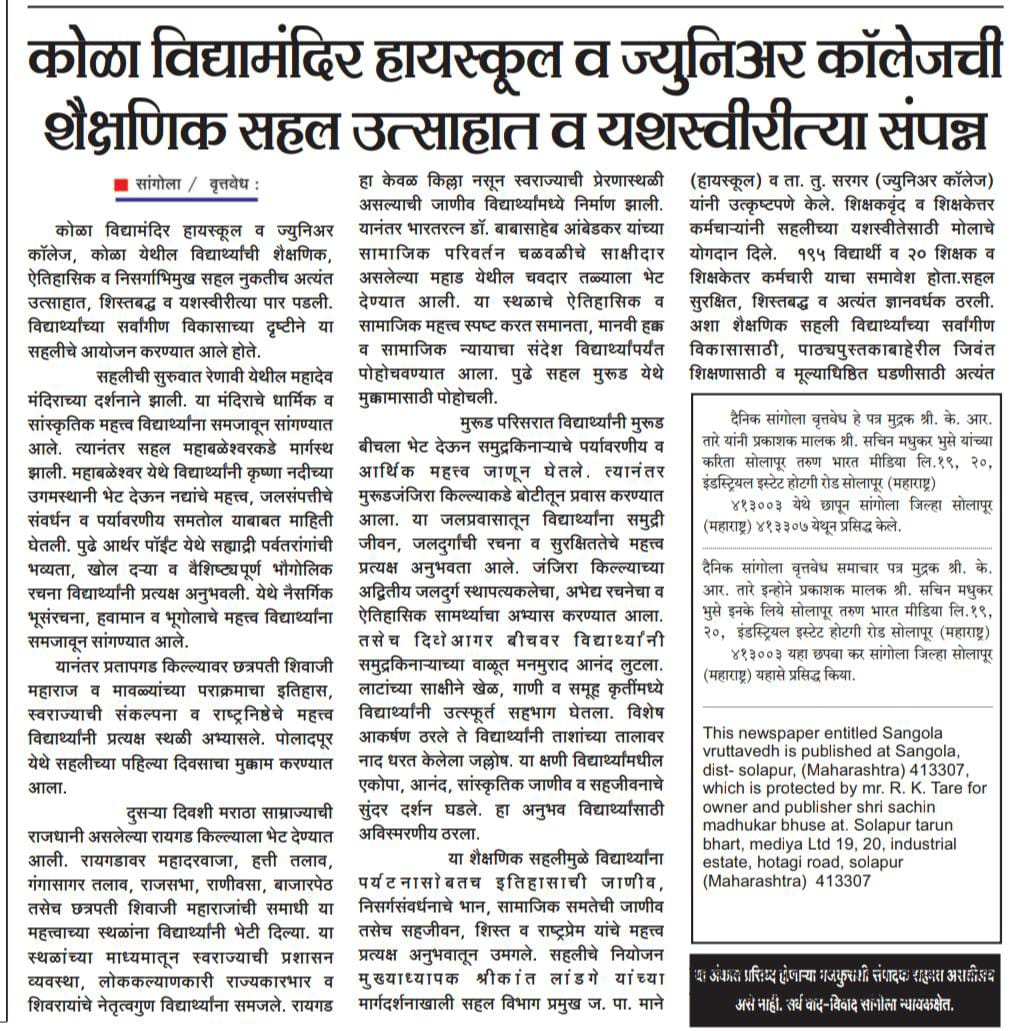 महिलांना एक देवी शक्ती मिळालेली आहे कोळा विद्यामंदिरची शैक्षणिक सहल उत्साहात संपन्न कोळा विद्यामंदिर हायस्कूल व ज्युनिअर कॉलेजचे जिल्हास्तरीय कब्बड्डी स्पर्धेत घवघवीत यश तालुकास्तरीय कुस्ती स्पर्धेत कोळा विद्यामंदिरचे घवघवीत यश कोळा विद्यामंदिर प्रशालेचे शिष्यवृत्ती परीक्षेत उत्तुंग यश