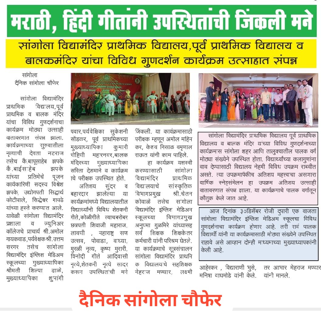 सांगोला विद्यामंदिर प्राथमिक विद्यालय ,पूर्व प्राथमिक विद्यालय व बालक मंदिर यांचा विविध गुणदर्शन कार्यक्रम उत्साहात संपन्न मराठी , हिंदी गीतांनी उपस्थितांची मने जिंकली सांगोला विद्यामंदिर प्राथमिक विद्यालयाची इयत्ता दुसरीची क्षेत्रभेट (परिसर भेट ) सांगोला तहसील कार्यालय येथे संपन्न सांगोला विद्यामंदिर प्राथमिक विद्यालयात श्रीकृष्ण जन्माष्टमी साजरी सांगोला विद्यामंदिरमध्ये गुरुपौर्णिमा उत्साहात साजरी