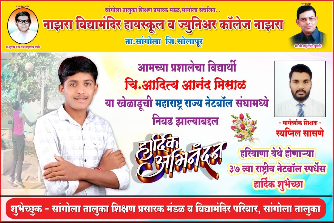 कै.गुरुवर्य बापूसाहेब झपके यांच्या 42 व्या स्मृती समारोहानिमित्त घेण्यात आलेल्या जिल्हास्तरीय वक्तृत्व स्पर्धेमध्ये इ. 8 वी ते 10 वी गटामध्ये नाझरा विद्यामंदिर प्रशालेतील कुमारी ऋतुजा दिगंबर शिंगाडे इयत्ता.10 वी तुकडी - ब या विद्यार्थिनीने तृतीय क्रमांक