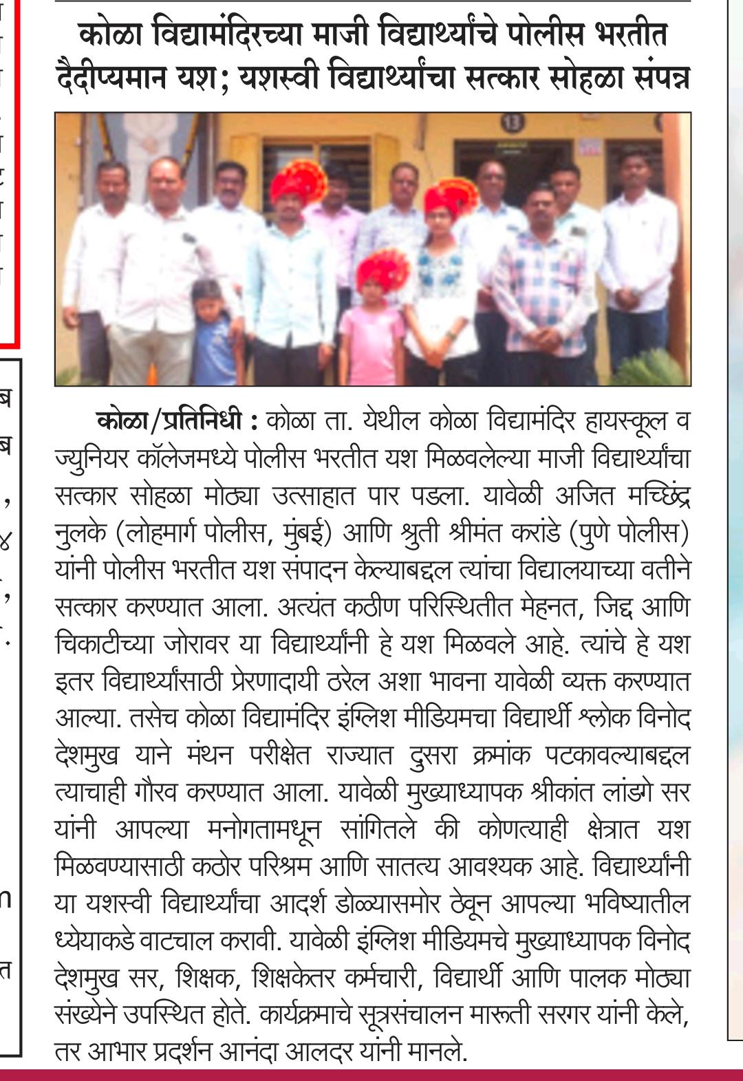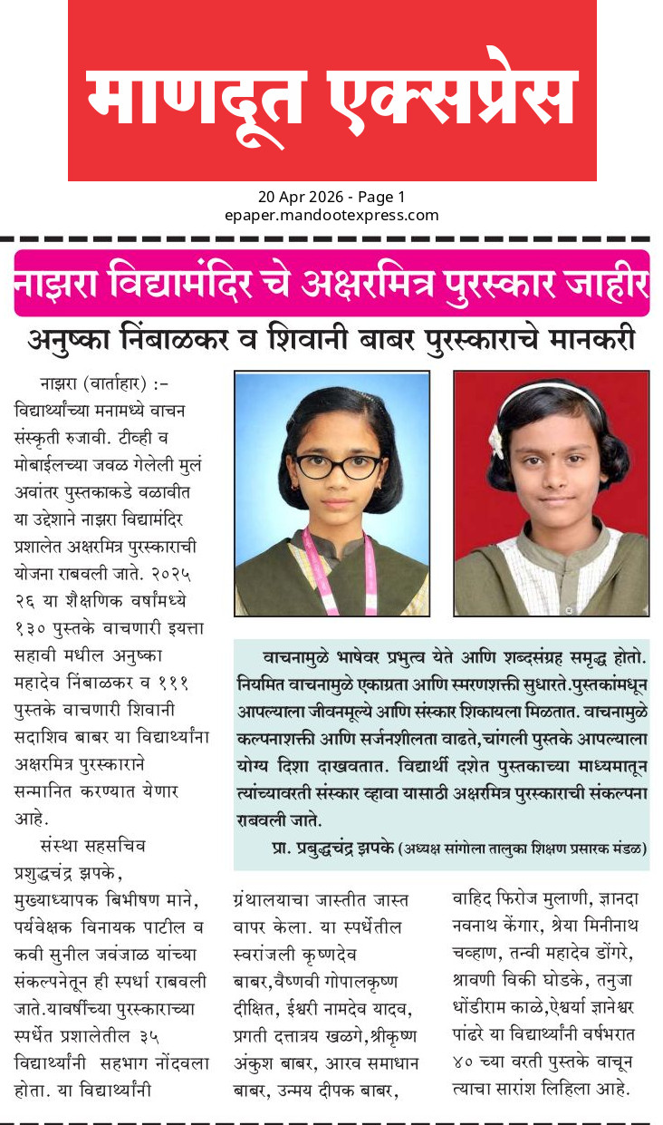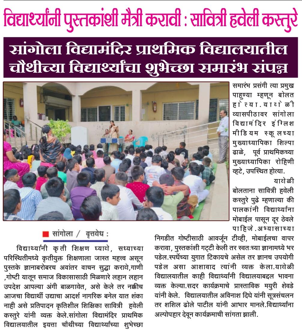 सांगोला विद्यामंदीरच्या १७३ विद्यार्थ्यांचे एनएमएमएस परीक्षेत यश श्र्वेता पवार हिची पोलीस उपनिरीक्षक पदी निवड ;विद्यामंदिर परिवाराच्या वतीने सत्कार संपन्न सांगोला विद्यामंदिरचे अमृत महोत्सवी वर्षात पदार्पण प्रा .राजेंद्र ठोंबरे यांचा साहित्यिक प्रवास कौतुकास्पद-सयाजीराजे मोकाशी सांगोल्यात संभाजी कदम बास्केटबॉल अकॅडमीस सुरवात महिलांना एक देवी शक्ती मिळालेली आहे सांगोला तालुका शिक्षण प्रसारक मंडळ ,सांगोला या संस्थेत गुणात्मक व संस्कारक्षम पिढी घडविण्याचे काम होते -श्री. शांतीनाथ मांगले तालुकास्तरीय विज्ञान प्रदर्शनामध्ये विद्यामंदिरचे सुयश विज्ञान प्रदर्शनात माने,नवले,काटे द्वितीय सांगोला विद्यामंदिर इंग्लिश मेडिअम स्कूलची शैक्षणिक सहल संपन्न मराठी , हिंदी गीतांनी उपस्थितांची मने जिंकली सांगोला विद्यामंदिर प्राथमिक विद्यालय ,पूर्व प्राथमिक विद्यालय व बालक मंदिर यांचा विविध गुणदर्शन कार्यक्रम उत्साहात संपन्न सांगोला विद्यामंदिरच्या साक्षी केदारची राज्य बॉक्सिंग स्पर्धेसाठी निवड सांगोला तालुका शिक्षण प्रसारक मंडळाचा संस्कारक्षम संस्था पुरस्काराने आज होणार सन्मान सांगोला विद्यामंदिर इंग्लिश मेडिअम स्कूलचे कराटे स्पर्धेत यश